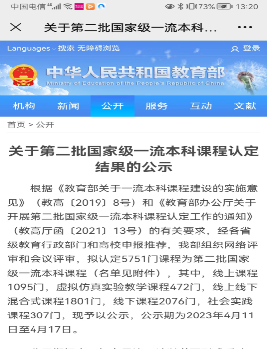 2023年4月11日,教育部发布《关于第二批国家级一流本科课程认定结果的公示》,我院李德民教授团队的《孔孟老庄的人格修养》课程(线上)、颜冰教授团队的《传播学》课程(线下)被认定为国家级一流本科课程。这是我院课程建设继获得省级一流本科课程认定后的国家级重大收获。