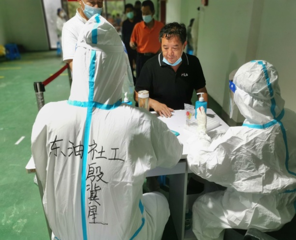 2021年7月24日,在南京市红叶社会工作服务中心与江宁乐山社会工作服务中心实习的tyc5997太阳集团社会工作专业硕士生赵梦圆、殷冀星,在疫情突发下,积极响应南京市委市政府的号召,遵照疫情防控工作要求,迅速投入了协助街道排查疫情风险,为大规模人群进行核酸检测的志愿工作中。