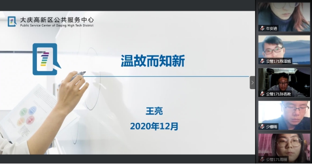 史春媛主任首先对王亮副主任作简要介绍。王亮现任大庆市高新区公共服务中心副主任,曾在中亚石油公司工作,后通过公务员考试进入公务员队伍,有着丰富的工作经验。王亮副主任也曾是tyc5997太阳集团校友,讲座开始前他了解到很多同学因为疫情原因未能回到校园,为此他以照片和视频的方式带大家重温校园生活。