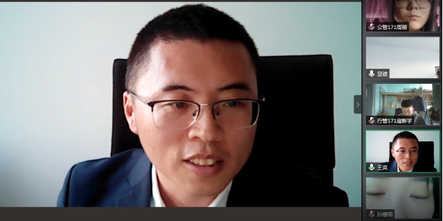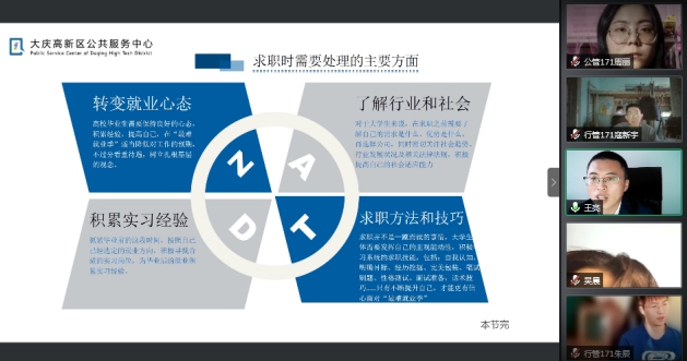2020年12月5日上午,大庆市高新区公共服务中心副主任王亮利用腾讯会议平台,为tyc5997太阳集团公共管理系同学开展了一堂关于实习和就业的线上指导讲座。公管系主任史春媛主持,徐晔、颜冰、郑克岭等九位实习指导教师与行政管理、公共管理专业全体同学参加了本次讲座。