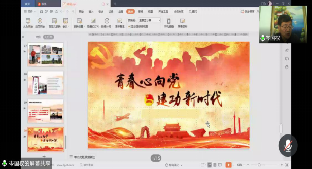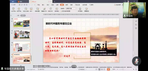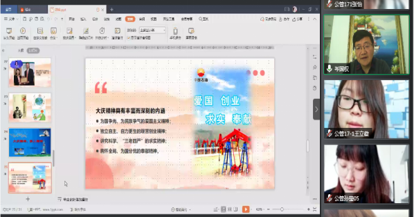 2020年11月21日上午,大庆府民物业管理有限公司西城区项目党支部书记岑国权利用腾讯会议直播平台,为公共管理系同学开展了一堂关于实习和就业的线上指导讲座——《青春心向党 建功新时代》。公管系主任史春媛主持,徐晔、颜冰、蒋召宇、韩磊娟、姜郸等实习指导教师与2017级公管系全体同学参加了本次讲座。