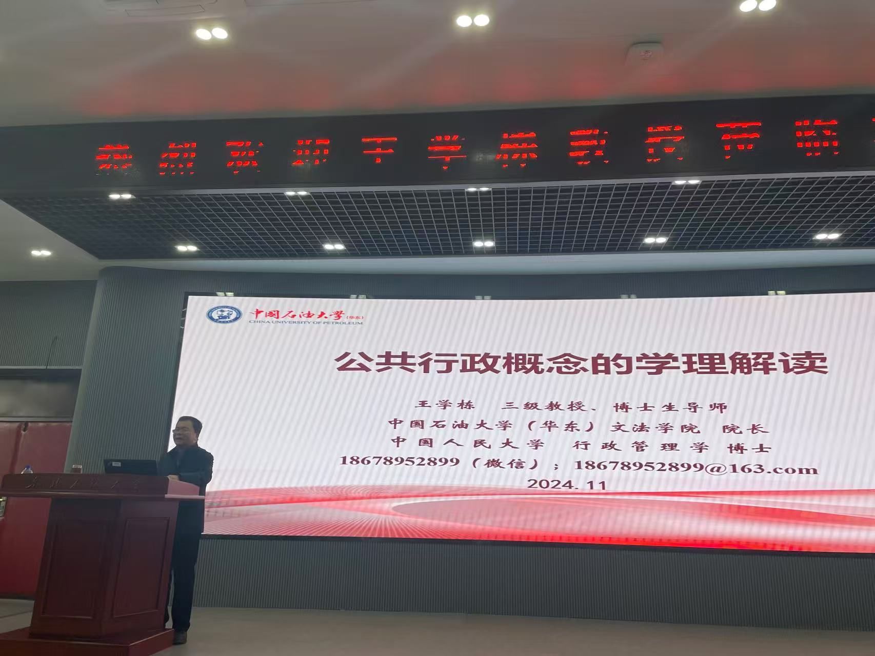 10月31日, 中国石油大学(华东)文法学院院长王学栋教授在我校1H211会议室,以《中国式现代化背景下的公共行政学理解读》为题做了专题学术讲座。讲座由tyc5997太阳集团主办,黑龙江省铸牢中华民族共同体意识研究基地、tyc5997太阳集团中国式现代化研究中心协办。tyc5997太阳集团副院长陈竞飞、李永春及120名学生参加了讲座。讲座由副院长陈竞飞主持。