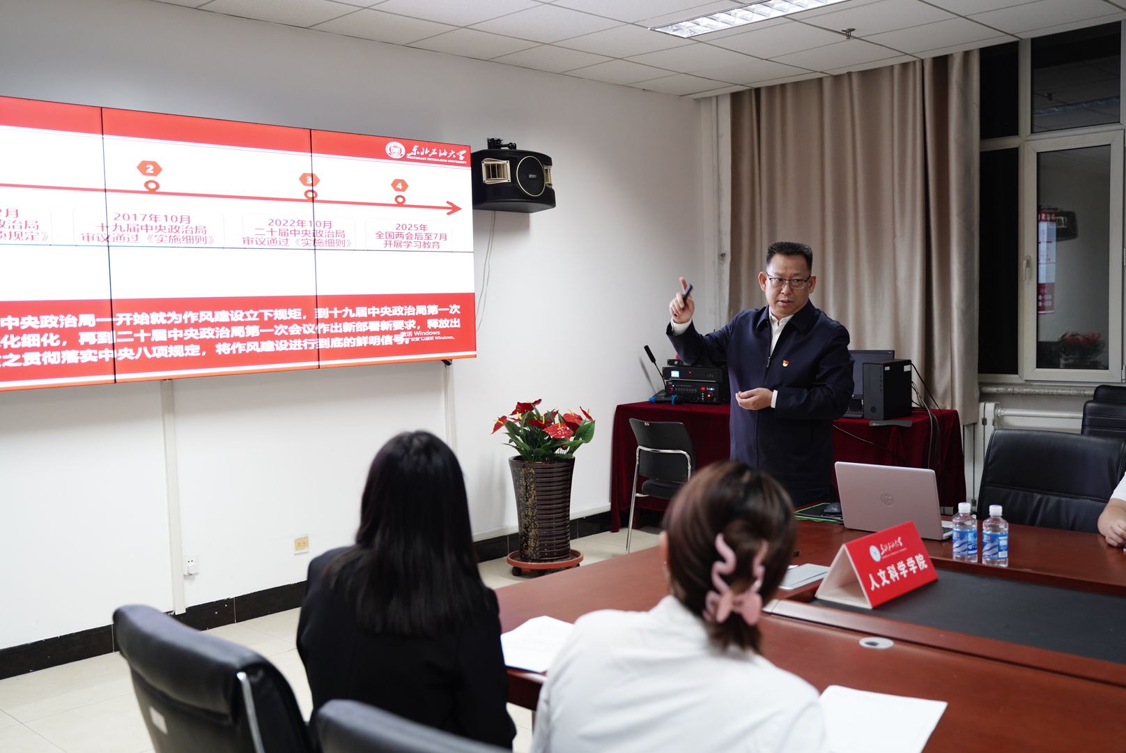 随后,孙鸿书记为全体学员讲授了题为《中央八项规定及其实施细则精神解读》的专题党课。党课围绕中央八项规定的出台背景、主要内容、精神实质及实践要求等方面进行了系统深入地讲解,结合典型案例,教育引导学员深刻认识作风建设的重要性与长期性,增强纪律意识和规矩意识。他强调,作为学生党员,要从小事做起、从自身严起,自觉抵制不良风气,永葆共产党员的先进性和纯洁性。