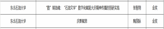 两项金奖作品紧扣新文科“跨学科、重实践、强创新”要求,展现了深厚的学术价值与应用潜力。其中一项目聚焦“石油文学”数字化传播,深入挖掘大庆精神内涵,以数字技术赋能红色文化传承;另一项目创新整合艺术疗愈资源,构建特色工作坊模式,探索艺术与心理健康教育的跨学科融合路径,彰显了人文关怀与科技创新的有机结合。