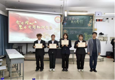 比赛设置了同时答题、轮流答题和抢答三个环节,参赛队伍围绕党史、团史、党的理论创新成果、国家发展成就等多方面展开角逐。经过一番激烈的竞争,社工25-1班代表队的杨锦波、李梦瑶、赵家仪、刘奕萱一举夺魁,斩获本次大赛一等奖;行管25-2班代表队的许静怡、陈雅婷、宋洋、杜蒙爱获得二等奖;中文25-2班代表队的王悦馨、陈诗涵、修哲、李文博获得三等奖。此外,行管25-1班代表队、中文25-1班代表队和社工25-2班代表队获得优秀奖。嘉宾为获奖队伍颁奖并合影。